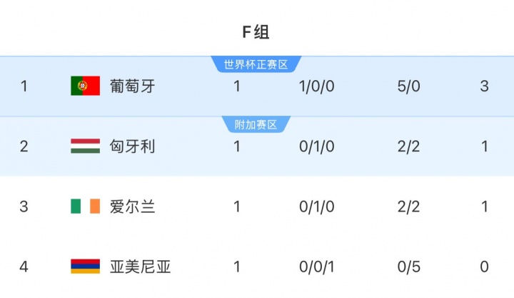 世界杯欧预赛,F组还剩5场比赛,葡萄牙同组对手包括匈牙利、爱尔兰和亚美尼亚。